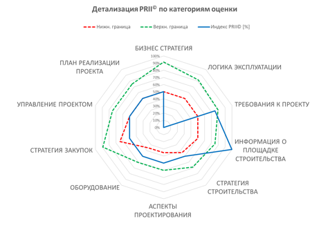 Рис. 4. Оценка PRII© проекта гражданского строительства по областям и категориям и референсные значения по бенчмарку