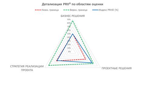 e) PRII© позволяет в режиме реального времени выполнить мониторинг статуса интегрированности бизнес-обоснования, производственных и технологических вопросов, проектных решений и стратегии реализации проекта. Оценка выполняется по относительно небольшому числу категорий, которое зависит от отрасли, в которой реализуется проект, Полученный результат сопоставляется с референсными значениями, взятыми из реальных практик. По мере апробации PRII© бенчмарк референсных значений может корректироваться.