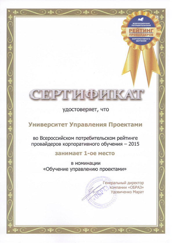 Университет Управления Проектами ГК ПМСОФТ признан лидером образовательных услуг в сфере управления проектами по версии Всероссийского потребительского рейтинга провайдеров корпоративного обучения. Рейтинг проводится ежегодно при поддержке журнала «КОРПОРАТИВНЫЕ УНИВЕРСИТЕТЫ» на основе отзывов заказчиков корпоративного обучения о качестве и общем уровне представления услуги.