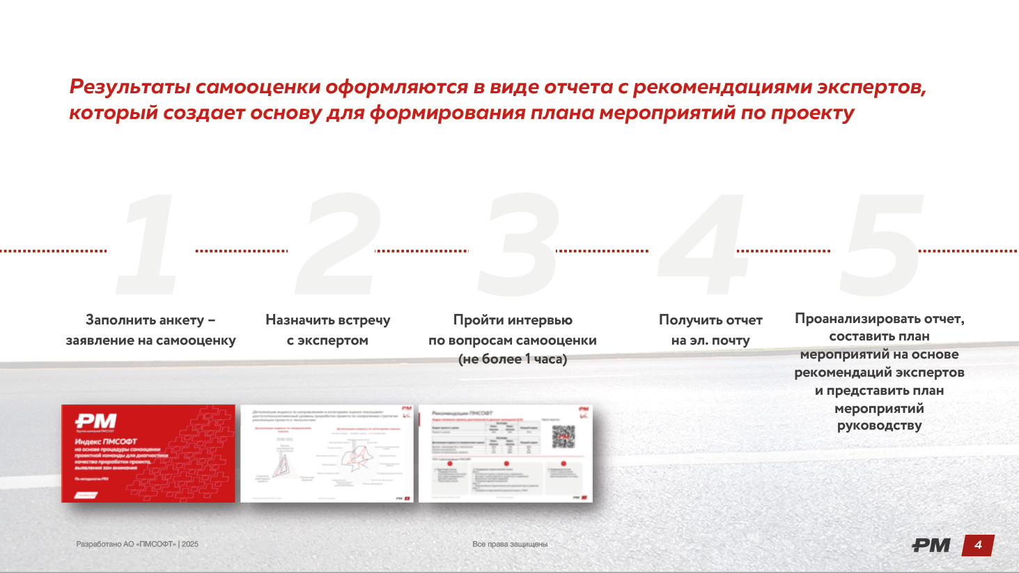 | 4 | Получить на свою электронную почту отчет с результатами и рекомендациями ПМСОФТ |