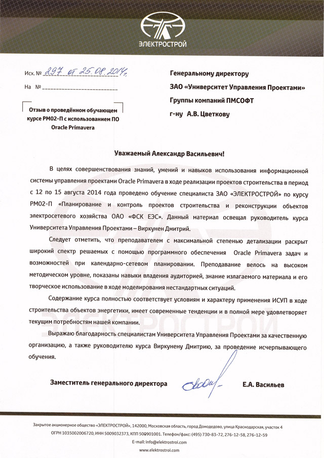 ЗАО «Электрострой» благодарит специалистов ГК ПМСОФТ за высокое методическое изложение курса PM02-П «Планирование и контроль проектов строительства и реконструкции объектов электросетевого хозяйства ОАО «ФСК ЕЭС». Участники программы отметили максимальную степень детализации и оценили широкий спектр возможностей решения задач календарно сетевого планирования с помощью ПО Oracle Primavera. Зам. ген. директора, Е.А. Васильев выразил благодарность за проведение исчерпывающего обучения и за соответствие содержания курса текущим потребностям компании.