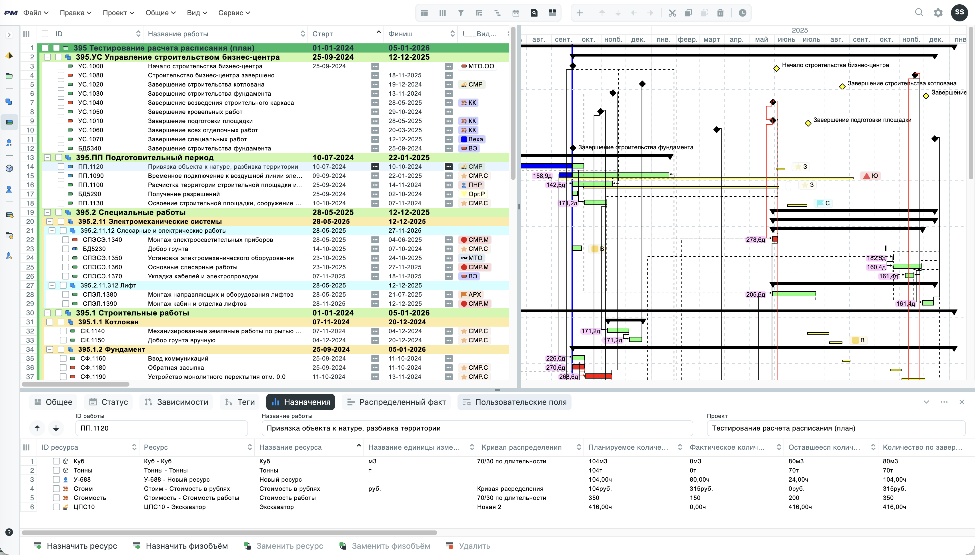 - Несколько назначений ресурсов на каждую работу, чтобы учесть все контролируемые параметры (обычно: трудовые ресурсы, крупные механизмы, физические метрики, ключевые контролируемые материалы).
